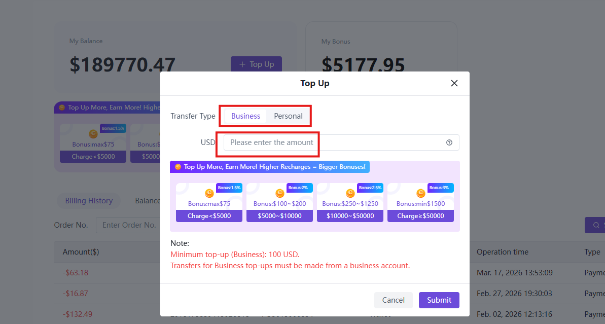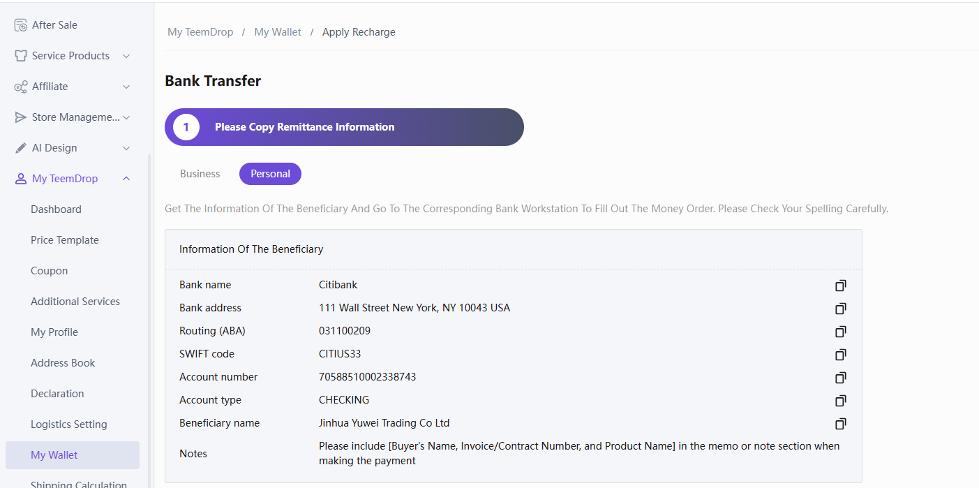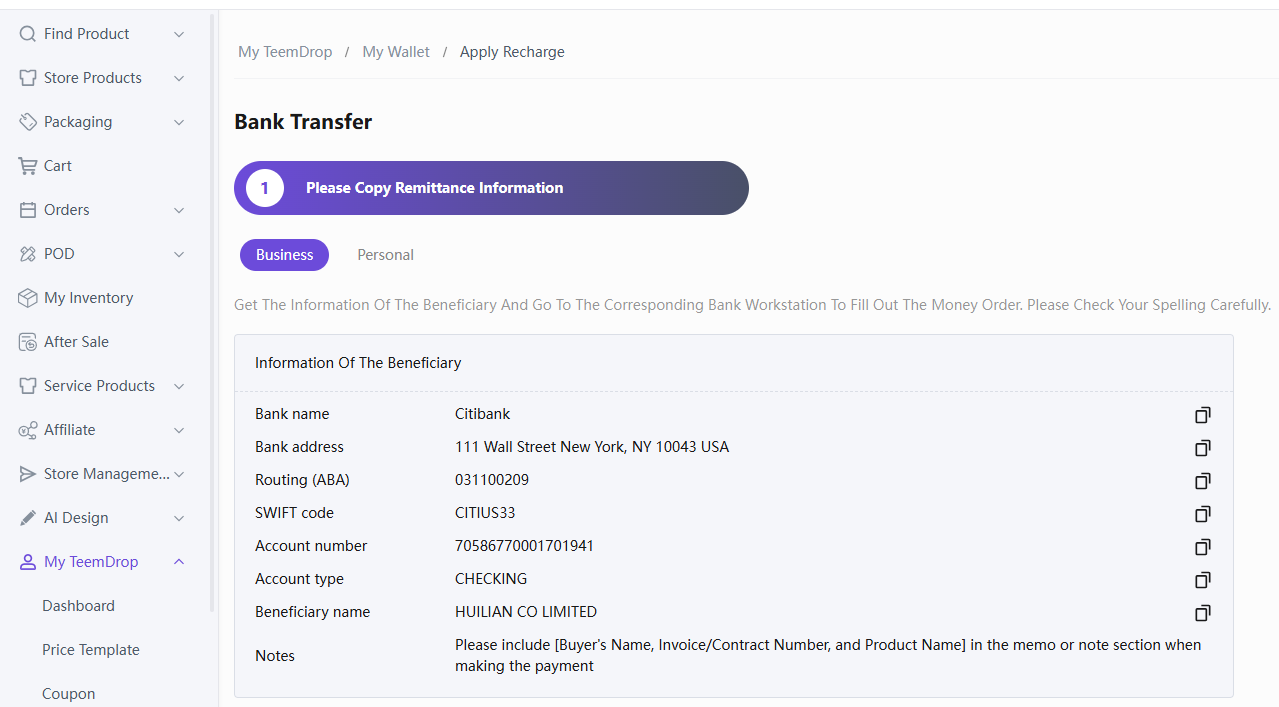 ⚠️ Minimum Amount for Business Transfer: $100 USD per transaction.