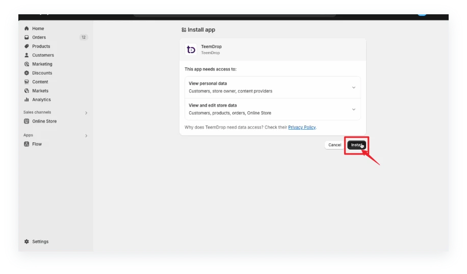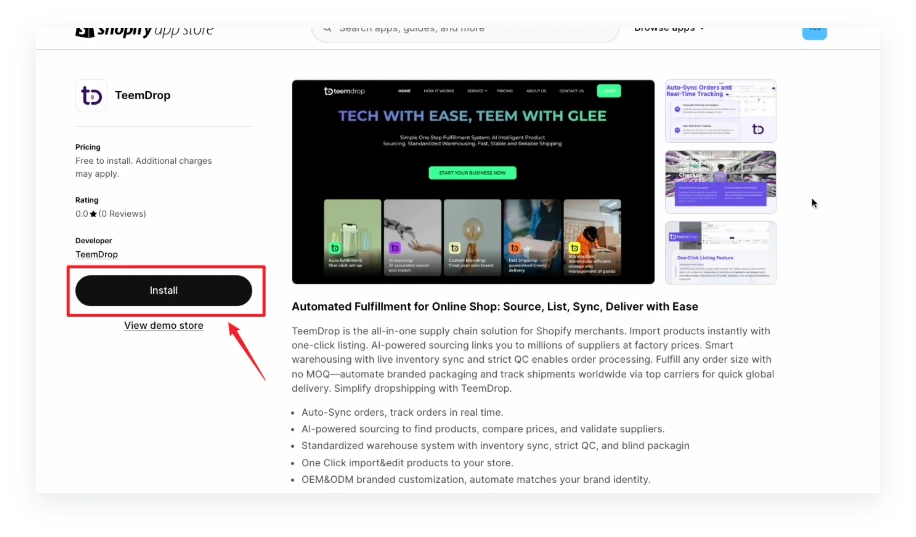 The page will automatically redirect to the Shopify App page (please ensure you're logged in to your Shopify account) , and click 【Install】